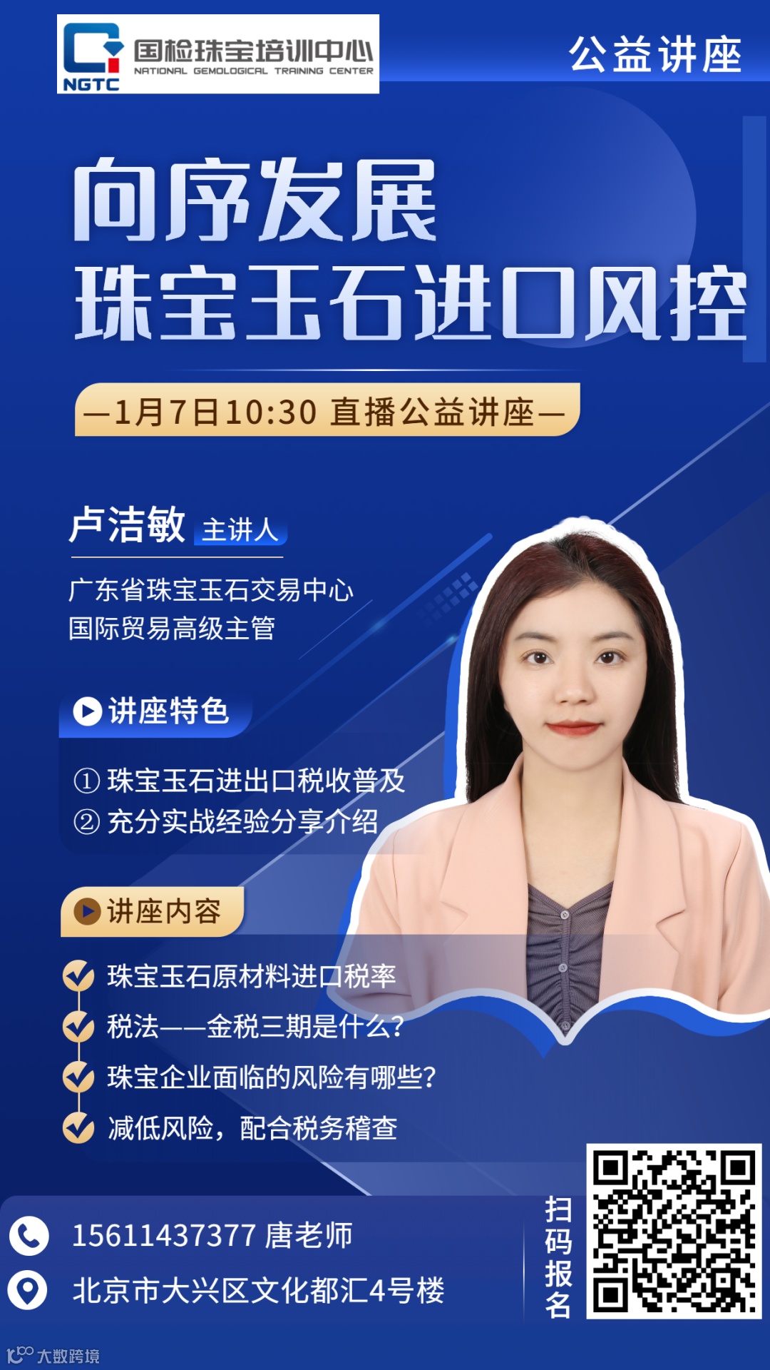 本期讲座将通过珠宝玉石的进出口品类分类和对应税收情况、海陆空运输方式的进口流程及实际操作、珠宝玉石的各种贸易方式以及进出口的风险管控等国际贸易体系下的全方位内容,为大家带来干货满满的珠宝玉石国际贸易知识和专业介绍。