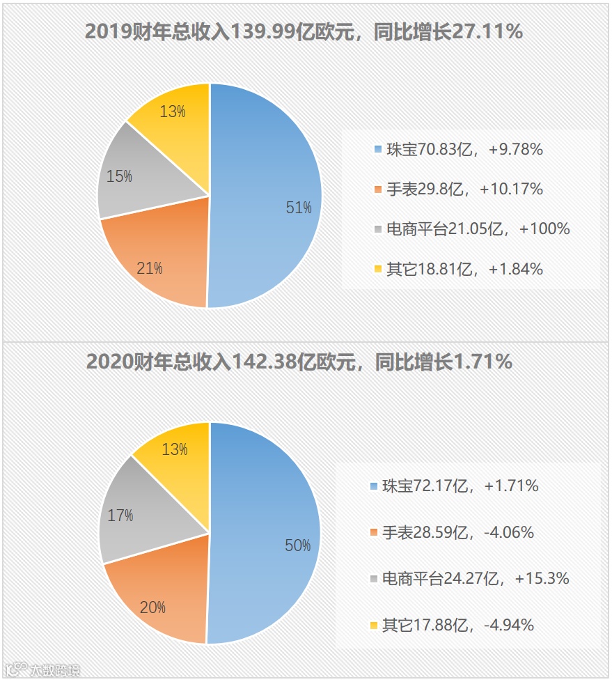 2020财年,在不确定的国际环境叠加财年末疫情等因素影响下,集团销售额增速较上一财年显著放缓,仅增长1.71%,营业利润下降22%至15.18亿欧元,净利润下降67%至9.31亿欧元。各业务板块的销售额方面,电商平台在公司持续的投入下依然保持了较高的增长率,珠宝板块收入微增,而手表及其它板块则出现了个位数的下滑。