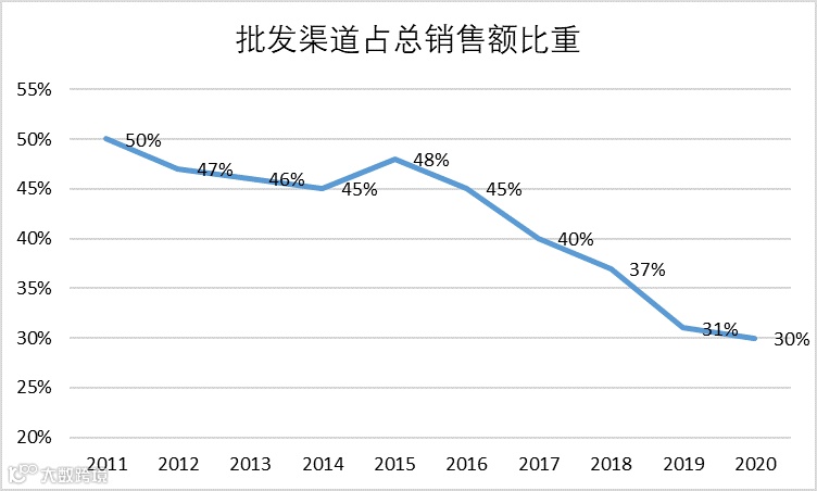 历峰集团近十年批发渠道销售额占比走势