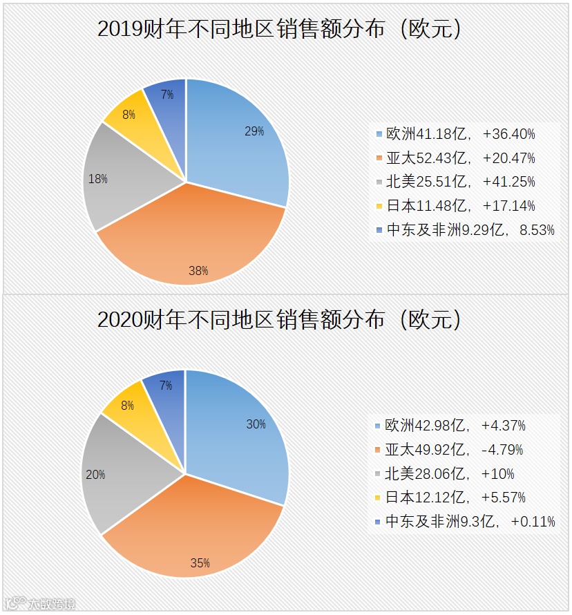2020财年,亚太地区销售额增速下降至-4.79%,占比也由前一年的38%下降至35%。在上半个财年中,中国和韩国都取得了两位数的增长,但香港地区由于不稳定的社会环境导致销售额下降逾4成;下半个财年里,突如其来的疫情使得整个亚太地区都受到了冲击,1-3月份整体销售额降幅达到37%。另一方面,两大电商平台业务尚未在亚太全面铺开,也成为亚太地区和欧美地区销售额差距缩小的主要原因。