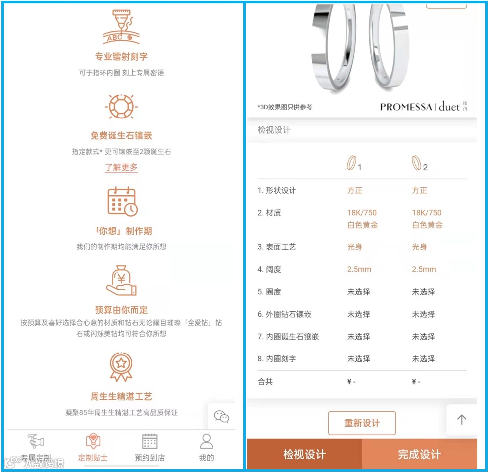 2020年,周生生进一步升级了钻石镶嵌饰品的定制服务,结合不同电商平台的小程序,消费者可以选择不同款式的镶嵌产品,并根据自己的偏好和预算选择宝石和金属材质。订制产品共有戒指、对戒、项链、耳环四类,其中对戒可对形状、表面工艺、阔度、圈度、镶石、刻字等环节进行自由搭配,共有超过6000款组合,并可实时生成3D效果图。