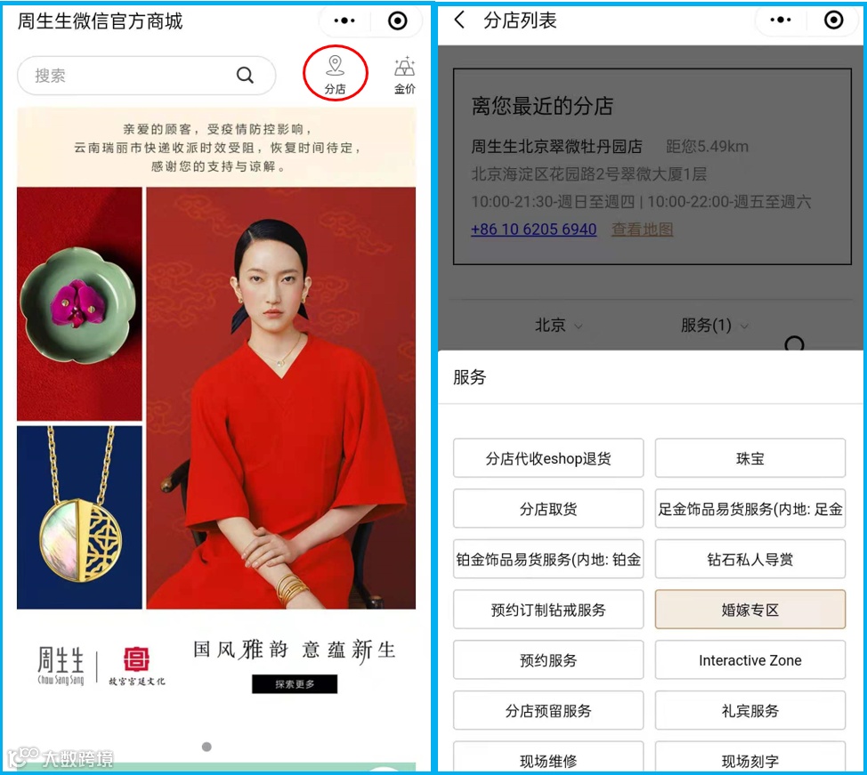 2014年,周生生首次提出要打造全渠道购物体验的概念,彼时的全渠道体验主要内容是在店内通过科技设备体验珠宝虚拟试戴,以及使用PAD/手机APP查询周边店铺相关产品库存情况等 。经过多年的系统建设和消费者习惯的进化,如今周生生已可以真正做到线上线下在数据、产品、服务等维度的无缝对接。如下图所示,通过官方微信小程序,消费者可以根据对服务内容和子品牌的需求筛选距离最近的门店,也可以提前确定某款具体商品在哪些门店有售,实现了“线上搜索了解,线下体验提货”的模式,即打破了实体珠宝店覆盖客流有限的瓶颈,也弥补了线上渠道“体验感、安全感不足”的问题。周生生2020年报中指出,2020年是具有里程碑意义的一年,全渠道模式已被消费者广泛接受,并切实为品牌零售带来了全新的活力。