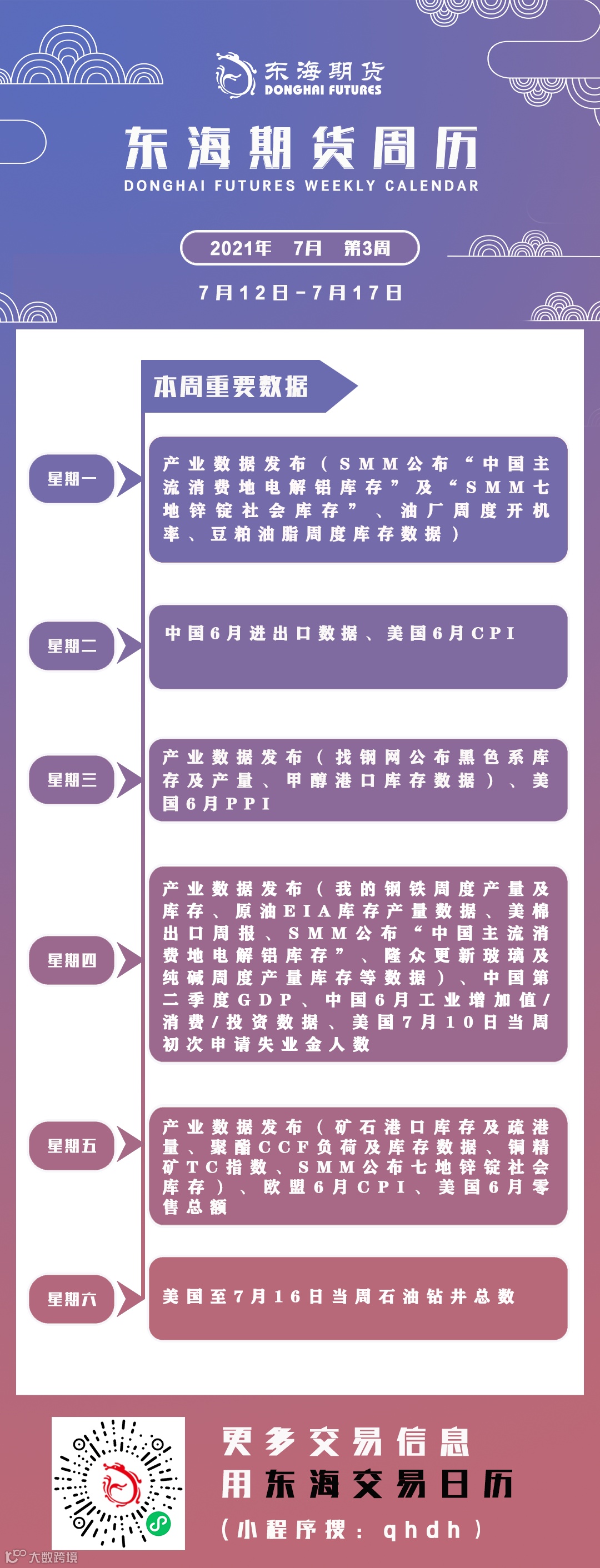 东海期市周历丨本周你需要知道的重要数据(7月12日-7月17日)