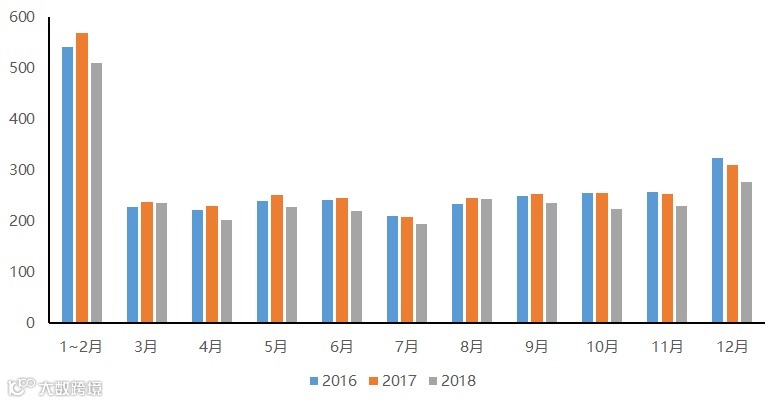 从近三年的单月数据来看,每年的12月、1月和2月为销售旺季,7月为淡季,其余各月份的销售数额分布较为平均;此外,除去3月和8月,2018年内各月份的金银珠宝消费数据均为近三年最低。