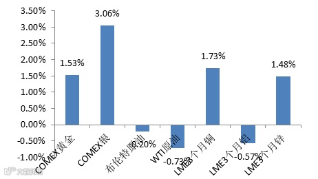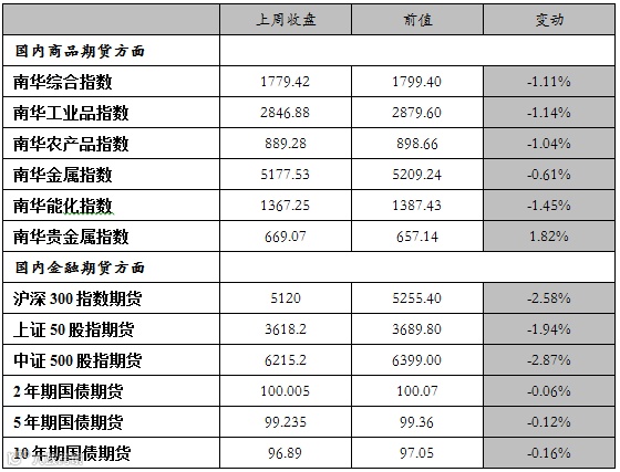 上周国内商品期货除贵金属板块外全部下跌,股指期货持续下跌,国债期货小幅收跌。