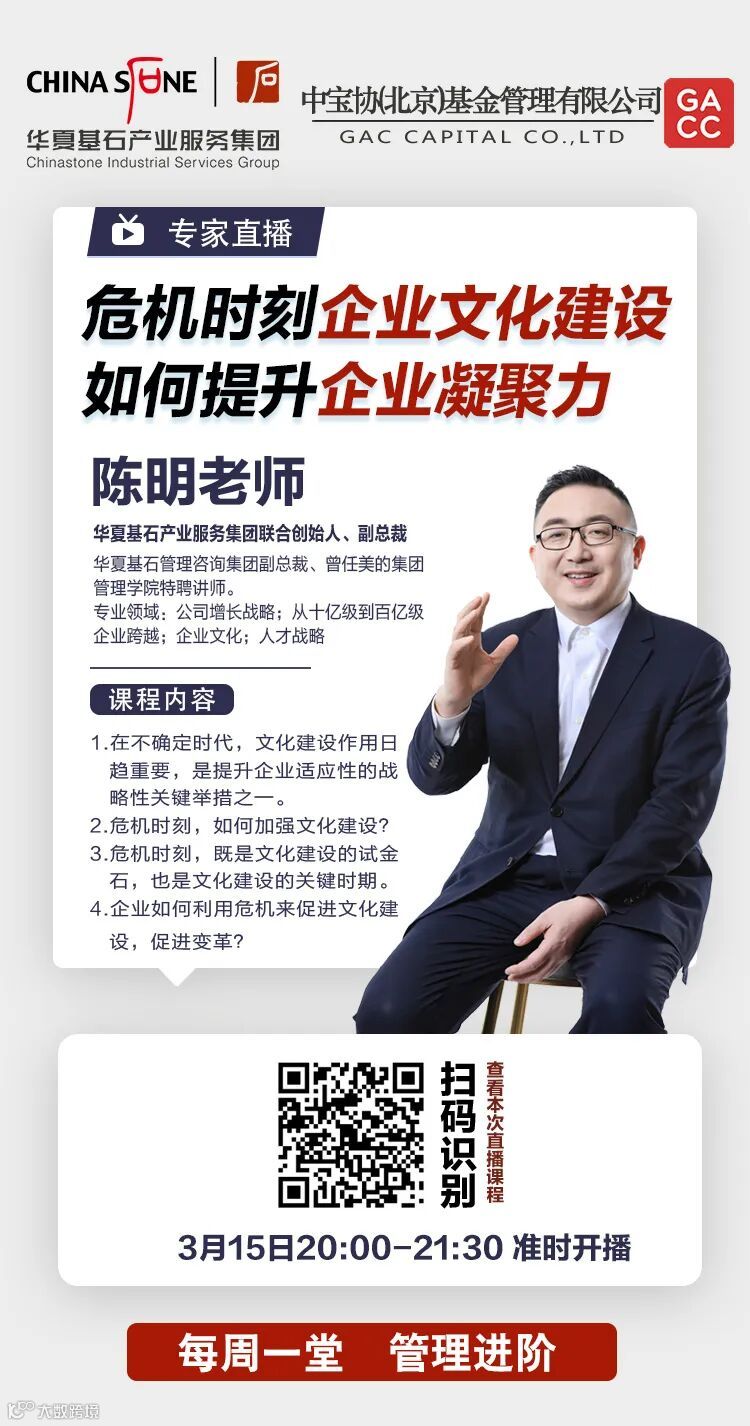 首期课程受到了企业家朋友们的广泛关注,参与人次达到了1.5万+,第二期课程我们请到了华夏基石产业服务集团联合创始人、副总裁,曾任美的集团管理学院特聘讲师的陈明老师,为我们讲解企业文化建设。