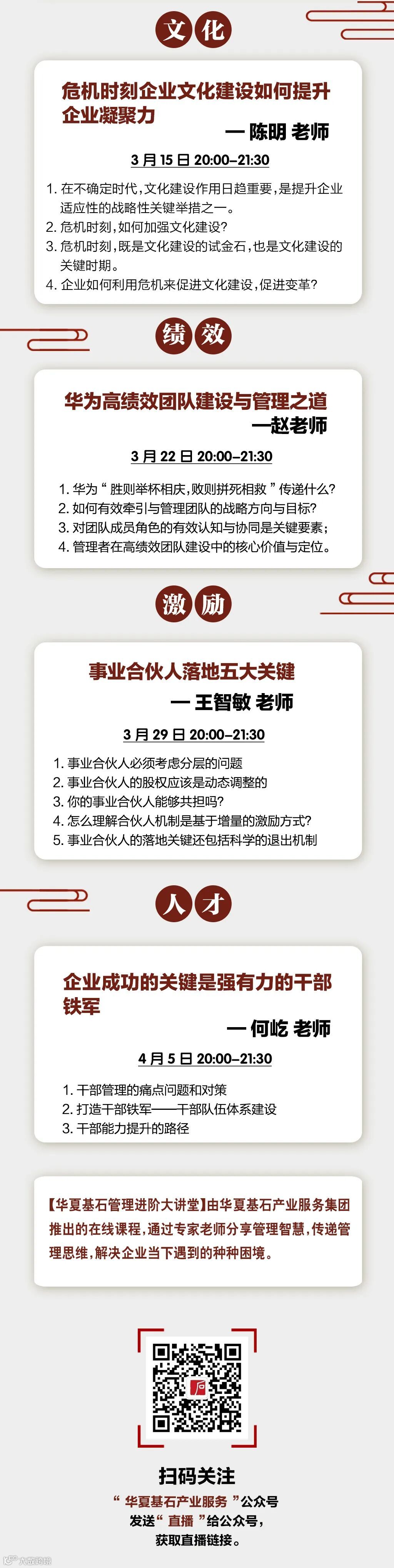 中宝协(北京)基金管理有限公司联合华夏基石产业服务集团共同为您推出管理进阶大讲堂,分别从营销、文化、绩效、激励、人才五个专题进行分享,帮助珠宝企业在战略层面得到拔高,助力珠宝企业实现管理提升!