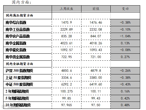 上周国内商品板块涨跌互现,股指期货小幅回调,国债期货小幅上涨。