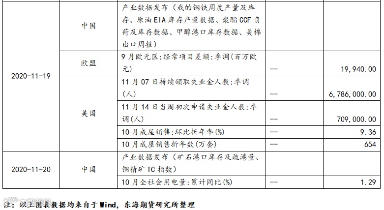 4. 11月19日(周四):产业数据发布(我的钢铁周度产量及库存、原油EIA库存产量数据、聚酯CCF负荷及库存数据、甲醇港口库存数据、美棉出口周报)、美国11月14日当周初次申请失业金人数