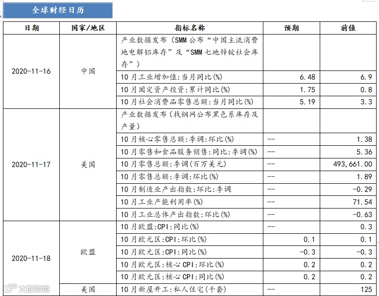 1. 11月16日(周一):产业数据发布(SMM公布“中国主流消费地电解铝库存”及“SMM七地锌锭社会库存”)、中国10月主要经济数据公布(消费、投资、工业增加值)
