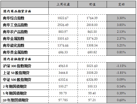 上周国内商品期货集体上涨,股指期货涨跌互现,国债期货延续上涨。