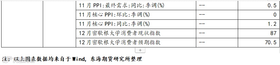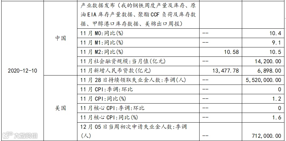 4. 12月10日(周四):产业数据发布(我的钢铁周度产量及库存、原油EIA库存产量数据、聚酯CCF负荷及库存数据、甲醇港口库存数据、美棉出口周报)、中国11月信贷数据(时间待定)、欧洲12月央行公布利率决议、美国11月核心CPI、美国12月05日当周初次申请失业金人数