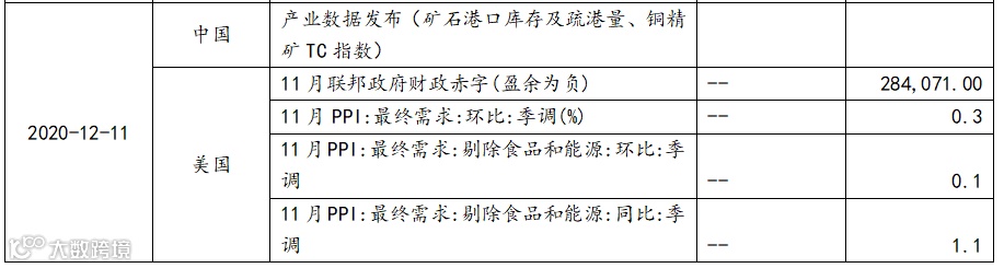 5. 12月11日(周五):产业数据发布(矿石港口库存及疏港量、铜精矿TC指数)、美国11月核心PPI
