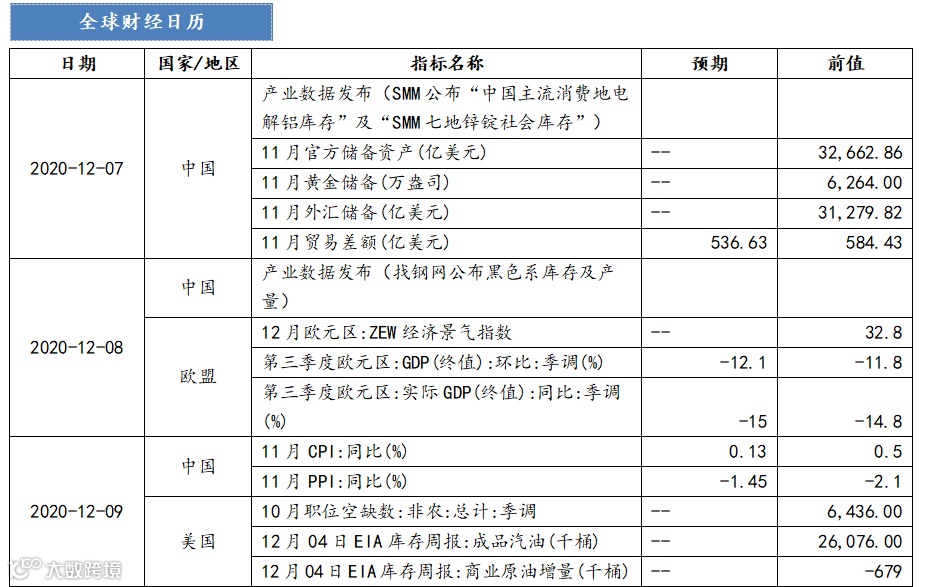1. 12月07日(周一):产业数据发布(SMM公布“中国主流消费地电解铝库存”及“SMM七地锌锭社会库存”)、中国11月进出口数据