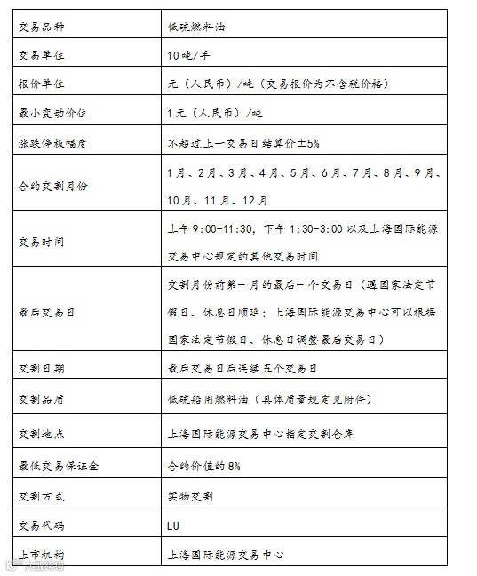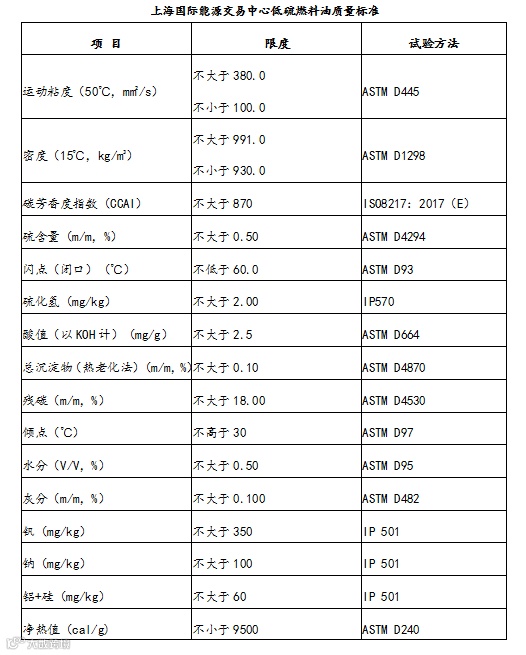 用于实物交割的低硫船用燃料油,质量应当符合上海国际能源交易中心低硫燃料油质量标准。低硫船用燃料油是指由石油制取的烃类均匀混合物,不排除为改善低硫船用燃料油的某些性能和特点而加入的添加剂。低硫船用燃料油应不含无机酸和使用过的润滑油,不能含有可能导致船舶使用异常的任何物质。低硫船用燃料油中不应人为加入可能产生危及船舶安全或对机械操作性能产生不利影响、损害身体健康、增加空气污染的任何添加物或化学废料。