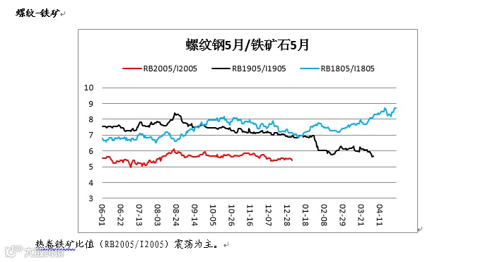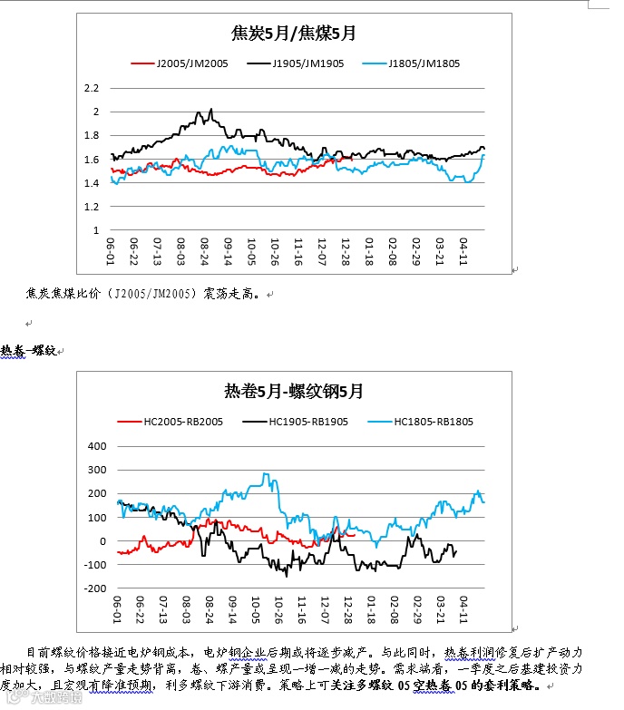 2、 目前螺纹价格接近电炉钢成本,电炉钢企业后期或将逐步减产。与此同时,热卷利润修复后扩产动力相对较强,与螺纹产量走势背离,卷、螺产量或呈现一增一减的走势。需求端看,一季度之后基建投资力度加大,且宏观有降准预期,利多螺纹下游消费。策略上可关注多螺纹05空热卷05的套利策略。