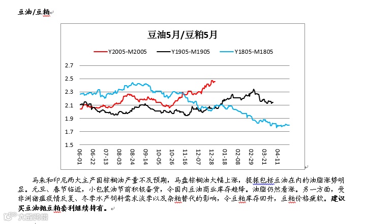 1、 马来和印尼两大主产国棕榈油产量不及预期,马盘棕榈油大幅上涨,提振包括豆油在内的油脂涨势明显。元旦、春节临近,小包装油节前积极备货,令国内豆油商业库存趋降。油脂仍然看涨。另一方面,受非洲猪瘟疫情反复、冬季水产饲料需求淡季以及杂粕替代的影响,令豆粕库存回升,豆粕价格疲软。建议关注买豆油抛豆粕套利策略。