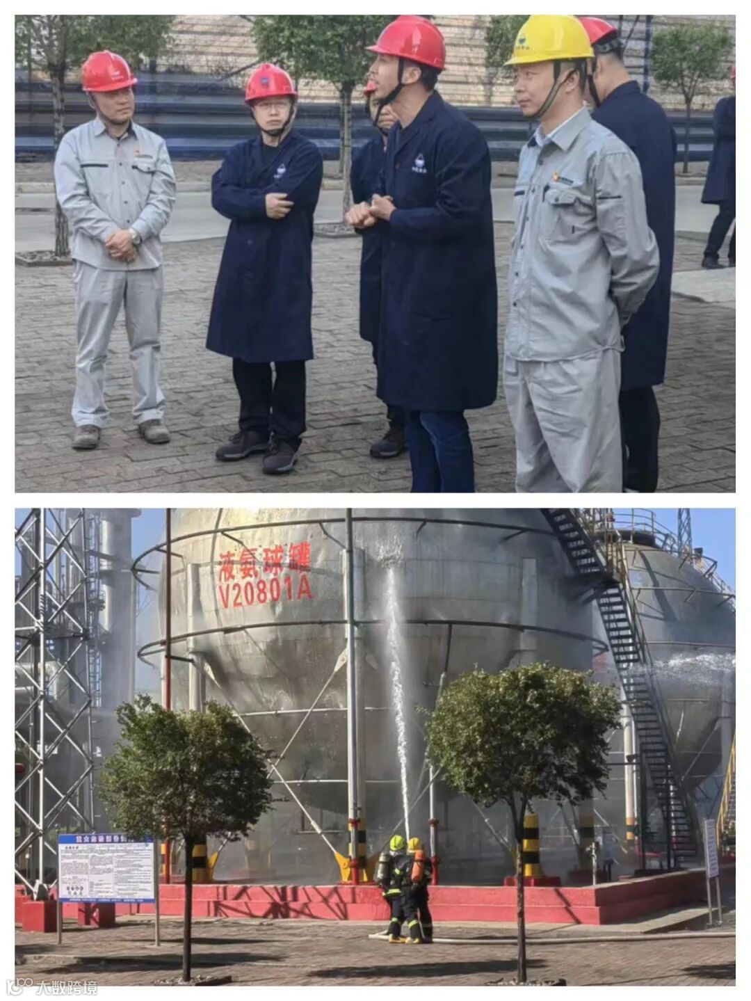 在检查重大危险源时,现场观摩液氨泄漏应急演练。