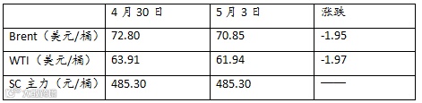 上周以来,美国原油产量和库存增长,对伊朗制裁影响不确定,欧美原油期货大幅下跌,WTI一度跌至一个月以来低点。然而美国就业人数上升,美元汇率下跌,欧美原油期货收盘反弹。周五(5月3日)纽约商品期货交易所西得克萨斯轻油2019年6月期货结算价每桶61.94美元,比前一交易日上涨0.13美元,涨幅0.2%,交易区间61.30-62.52美元;伦敦洲际交易所布伦特原油2019年7月期货结算价每桶70.85美元,比前一交易日上涨0.10美元,涨幅0.1%,交易区间69.95-71.54美元。