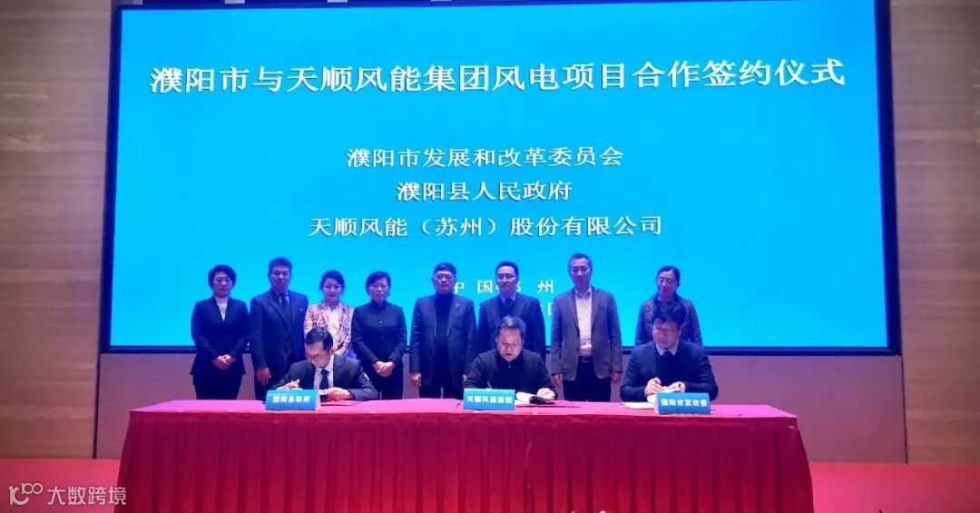 1月23日,天顺风能集团与濮阳市继风电叶片项目之后,再次就风电装备制造及风电场开发运营进一步深度合作达成一致,并在郑州举行隆重的签约仪式。濮阳市、县领导,发改委、招商投资促进局主要负责部门参加;天顺风能集团董事长严俊旭,设备事业部总裁陈伟明、资产服务事业部总裁包斌等公司高层出席签约仪式。