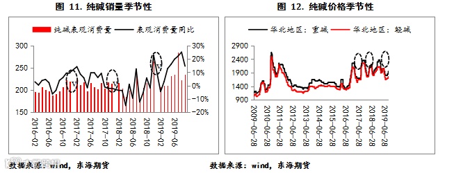 从纯碱消费的季节性上看,纯碱在年末呈现出明显的消费旺季特征,近3年来纯碱在12月和1月的表观消费量明显高于全年销量的均值水平,2016-20183年中12月和1月的纯碱表观消费量分别高于同年表消水平均值12.4%、2.6%、26.4%。
