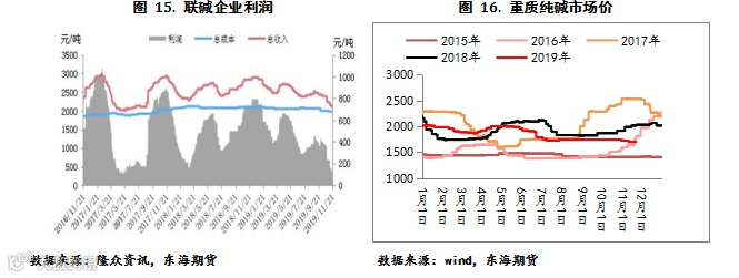 所以总的来说,玻璃需求变化不会在短期内传导到纯碱,更多地是基于玻璃和纯碱产能的对比变化而影响纯碱价格。而长期来看,产业链总体的利润决定了纯碱和玻璃所能分享的利润总额,产业景气整体下行时,纯碱和玻璃的价格也趋于同向变动,且玻璃价格表现出了一定的领先性。