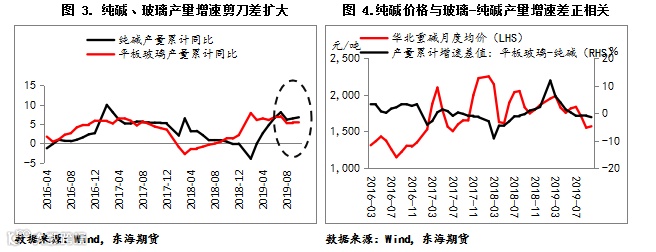 从玻璃和纯碱产量增速的变动差异来看,最为重碱主要的下游产品,两者的产量增速与纯碱的价格变动呈现明显的正相关。上下游产量增速的分化也是导致今年以来纯碱价格不断下行的原因。