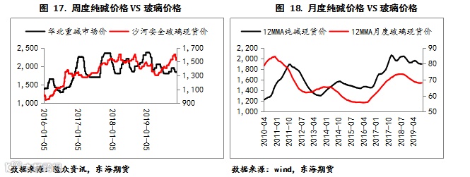 从玻璃生产的角度看,1吨玻璃需要消耗0.2吨纯碱,纯碱的采购费用占到玻璃生产成本的25%左右,但从短期来看,以周为尺度的纯碱和玻璃的现货价格并没有呈现出很强的相关性,两者价格走势劈叉的情况频繁出现,例如从今年5月开始至今,华北地区重碱价格从2050元/吨最低下降至1800元/吨,而华北厂家的玻璃原片报价则从1302元/吨上涨至1603元/吨。