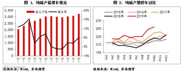 而由于2018年玻璃净增加产能较大程度的扩张,刺激了纯碱下游的需求及纯碱价格的抬升。最终也导致了纯碱产量增速的迅速抬升。