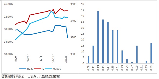 波动率为期权定价的关键因素,更是衡量期权价格高/低估的唯一指标。我们综合比较其和历史波动率的大小来预估商品期权定价。通过对豆粕主力近一年的历史波动率统计,其20日的波动率均值和中值分别为17.8%和16.14%,截止10.19,豆粕主力的IV和HV20分别为23.88%和15.2%,相比前周,H两者差值略微收敛,预期短期隐含波动率进一步降低的概率较高。