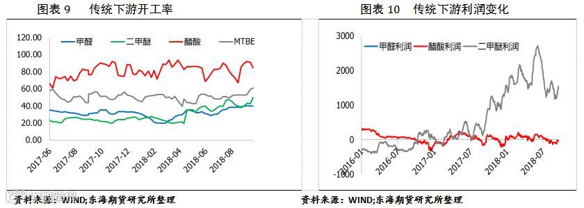 传统下游方面,占比最大的甲醛受季节性因素影响最为明显,每年从5,6月份随着北方高温以及南方阴雨天气的到来,甲醛也进入相对的淡季。再加上环保压力日增,在河北,河南,山东等甲醛产销集中区域,厂家多维持低负荷运行,甲醛的开工处于相对低位。进入9月以后,开始转入消费旺季,其中甲醛,二甲醚,MTBE的开工率以及利润相比上个月有所增加,虽然醋酸的开工率有所下滑,但仍处于相对高位(85%),利润相对去年同期也是大幅增加。
