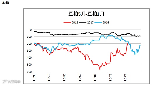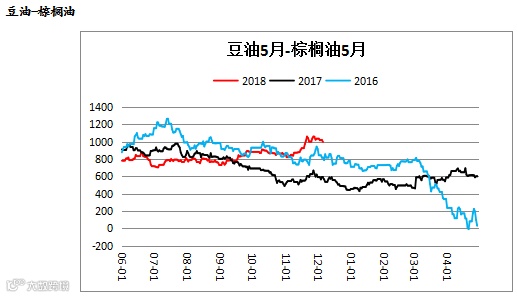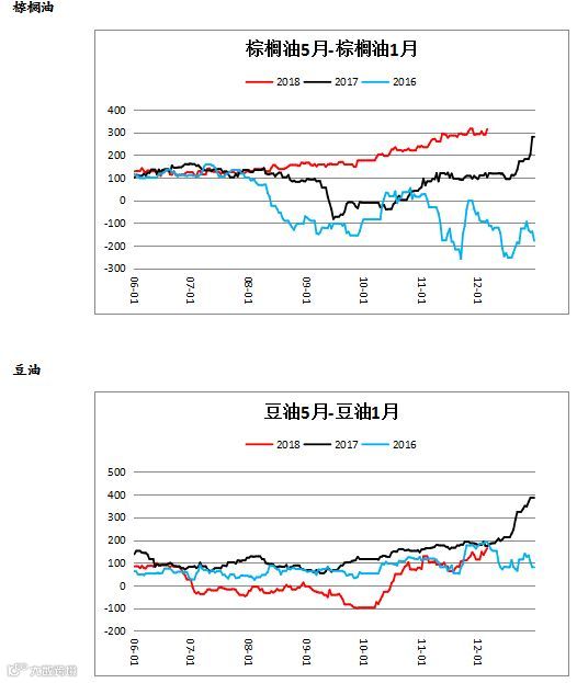 棕榈油跨期价差(P1905 – P1901),豆油跨期价差(Y1905– Y1901)震荡走高。