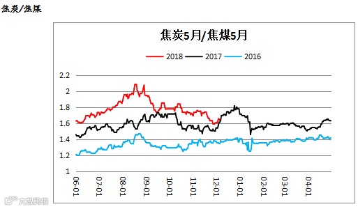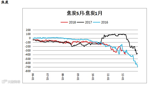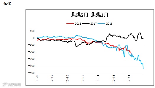焦煤跨期价差(JM1905 – JM1901)震荡下行,建议观望。
