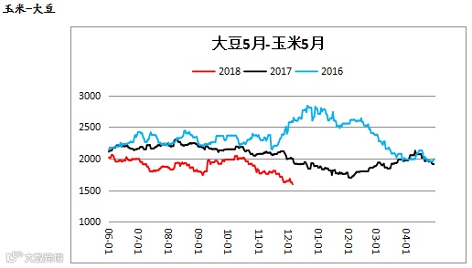 玉米大豆价差(C1905-A1905)震荡走高,建议观望。