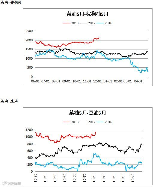 菜油棕榈油(OI1905 – P1905),菜油豆油(OI1905 – Y1905)价差震荡走高,建议观望。