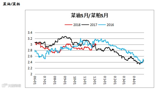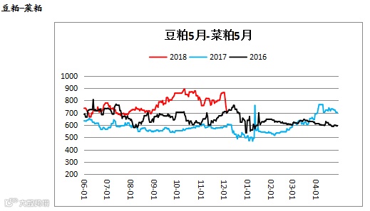 菜油菜粕价差(O1905– RM1905)价差小幅上行。