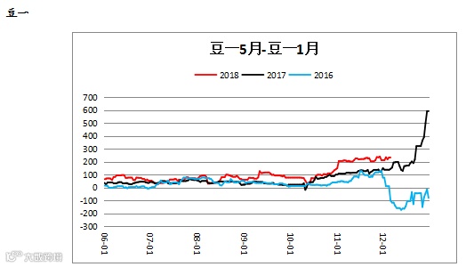 豆一跨期价差(A1905 – A1901)小幅走高。