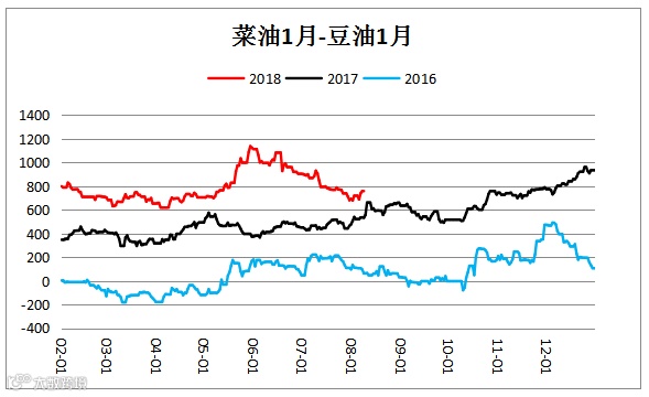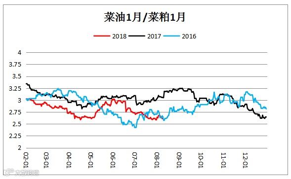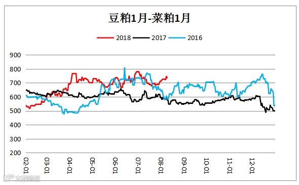 菜油菜粕价差(O1901– RM1901)价差震荡上行。