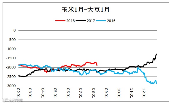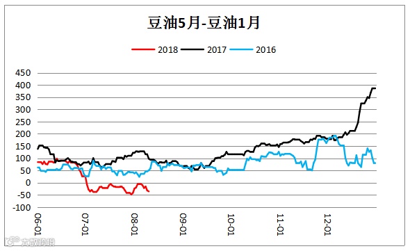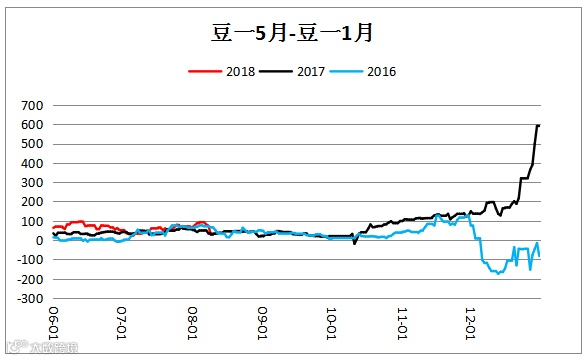 大豆跨期价差(A1905– A1901)小幅震荡。