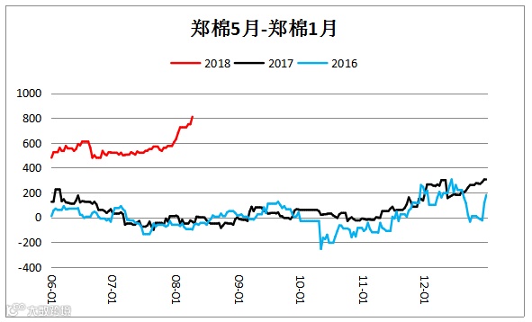 棉花跨期价差(CF1905– CF1901)震荡上行,未来行情有待观望。
