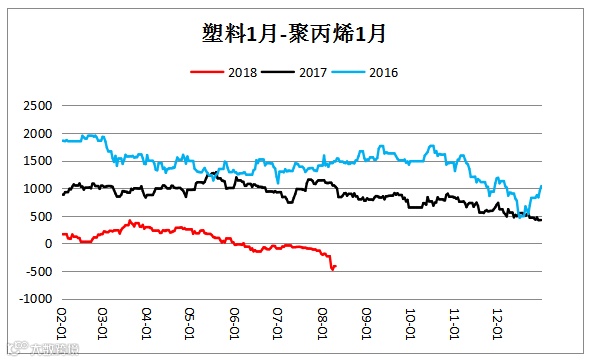 塑料聚丙烯价差(L1901– PP1901)震荡下行,未来行情有待观望。