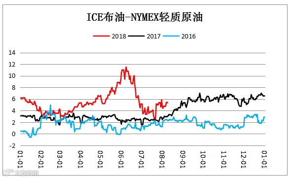 ICE布油与NYMEX轻质原油价差震荡上行。