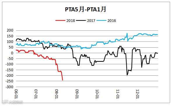 PTA跨期价差(TA1905 – TA1901)震荡下行,当前1-5价差已至低位,建议止盈离场建议观望。