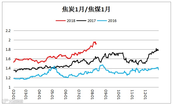 焦炭焦煤价比(J1901/ JM1901)震荡上行,建议观望。