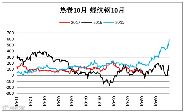 热卷螺纹钢价差(HC1810 – RB1810)震荡下行,建议观望。