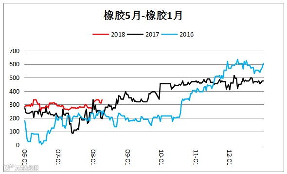 天然橡胶跨期价差(RU1905– RU1901)震荡上行。
