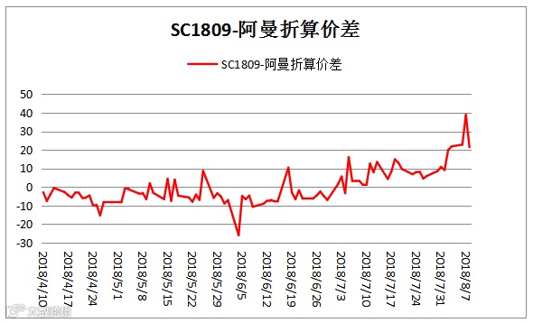 上期所SC1809收盘价与阿曼原油价差震荡下行。
