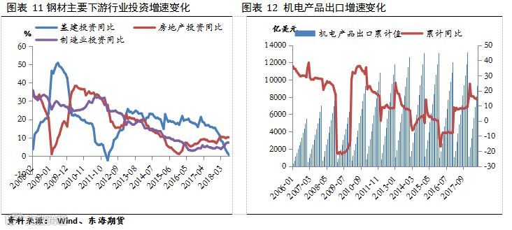 制造业方面,1-8月份制造业投资同比增长7.5%,增速较1-7月份回升0.2个百分点,今年以来该数据已经连续5个月回升。从行业上看,主要是受益于供给侧改革的上游行业回升明显,不过这也侵蚀了下游的盈利。同时,今年以来社会消费品零售总额持续走低,汽车、家电表现总体一般。且中美贸易战影响最大的即为机电产品出口,进而影响钢材的间接出口。1-8月份国内机电产品出口同比增长13.9%,较前7个月回落0.7个百分点,自2月份以来该数据一直呈现下滑态势,预计随着贸易战的发酵,机电产品出口将进一步走弱。故本轮制造业回升的持续性存疑,相关板材需求难有明显好转。