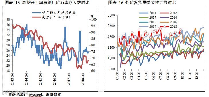 不过,我们也要注意到,四季度铁矿石市场的仍受到一些利空因素的压制。供给方面看,四季度为传统的外矿发货旺季,供应大概率回升,截止到9月28日,澳洲、巴西发货量为2638.3万吨,为年内次新高,且后期仍有继续增加趋势。需求方面来说,尽管环保限产边际有所放松,但考虑到冬季一般为全年空气质量较差的时间段,故一些地区仍可能会进行一些阶段性的限产,从而导致钢厂开工环比回落,这也将会对铁矿石需求产生一定影响。所以,短期矿价可能会呈现区间震荡,重心上移的态势,520元/吨仍是1901合约的阶段性高点。中期来看,考虑海外矿山扩产周期已经接近尾声,加之国内限产政策的精细化,故对远月的悲观预期需要进行修复,因此,我们认为1905合约后期或有趋势性的上涨行情。