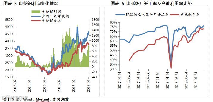 电炉钢产量的增加也不容忽视,螺纹钢现货价格的强势继续带动电炉钢利润以及开工的明显回升,根据我们计算,截止到9月25日,电炉钢利润为776.8元/吨,较月初上涨143.8元/吨。而截至到9月21日当周的电炉钢开工率达到76.54,较月初增加2.14个百分点,9月份之后,电炉钢开工率已经连续两周回升,且根据最新政策,今年采暖季期间京津冀地区电炉钢企业不限产,故后期电炉钢供应仍有回升可能。